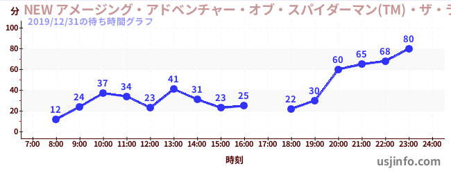 • NEW アメージング・アドベンチャー・オブ・スパイダーマン(TM)・ザ・ライド 4K3D$B$N(B2019年12月31日の待ち時間