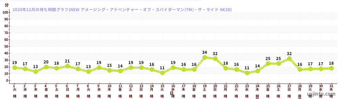 • NEW アメージング・アドベンチャー・オブ・スパイダーマン(TM)・ザ・ライド 4K3D$B$N(B2020年12月01日のの一日平均待ち時間