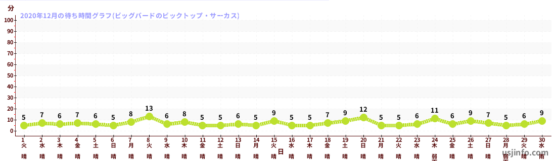 • ビッグバードのビックトップ・サーカス$B$N(B2020年12月01日のの一日平均待ち時間