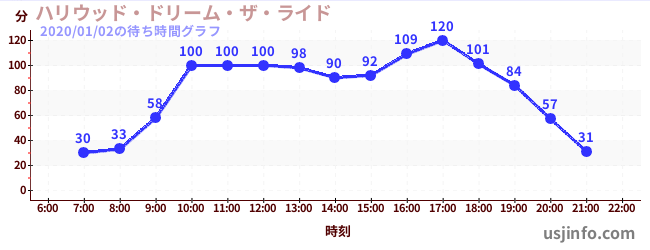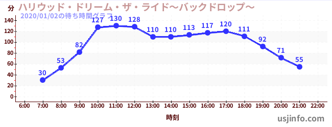 • ハリウッド・ドリーム・ザ・ライド〜バックドロップ〜$B$N(B2020年01月02日の待ち時間