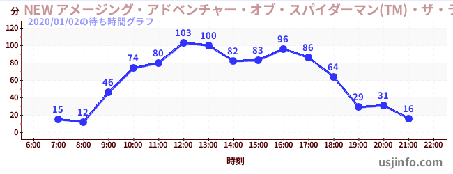 • NEW アメージング・アドベンチャー・オブ・スパイダーマン(TM)・ザ・ライド 4K3D$B$N(B2020年01月02日の待ち時間