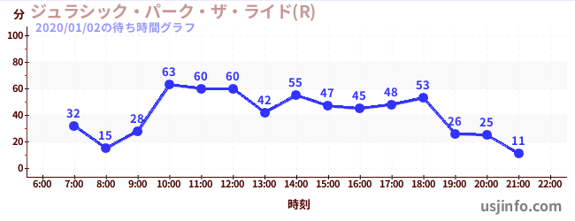 • ジュラシック・パーク・ザ・ライド(R)$B$N(B2020年01月02日の待ち時間