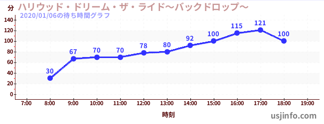 • ハリウッド・ドリーム・ザ・ライド〜バックドロップ〜$B$N(B2020年01月06日の待ち時間