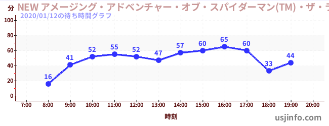 • NEW アメージング・アドベンチャー・オブ・スパイダーマン(TM)・ザ・ライド 4K3D$B$N(B2020年01月12日の待ち時間