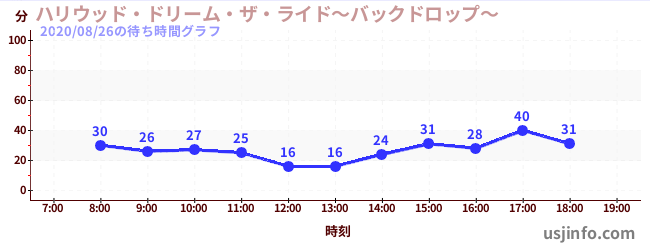 • ハリウッド・ドリーム・ザ・ライド〜バックドロップ〜$B$N(B2020年08月26日の待ち時間