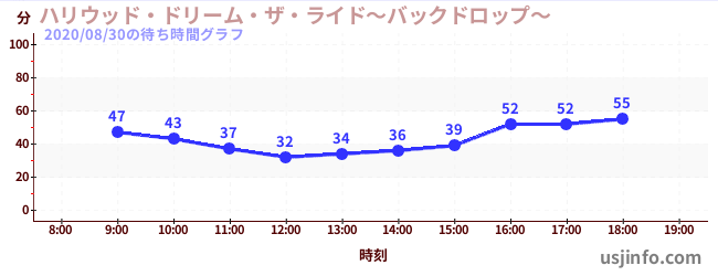 • ハリウッド・ドリーム・ザ・ライド〜バックドロップ〜$B$N(B2020年08月30日の待ち時間