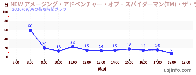 • NEW アメージング・アドベンチャー・オブ・スパイダーマン(TM)・ザ・ライド 4K3D$B$N(B2020年09月06日の待ち時間