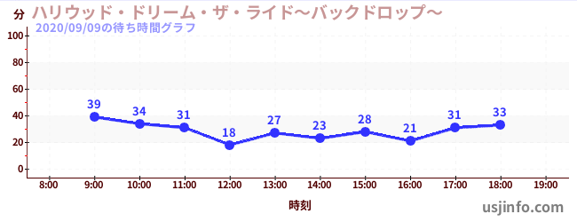 • ハリウッド・ドリーム・ザ・ライド〜バックドロップ〜$B$N(B2020年09月09日の待ち時間