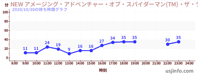 • NEW アメージング・アドベンチャー・オブ・スパイダーマン(TM)・ザ・ライド 4K3D$B$N(B2020年10月30日の待ち時間