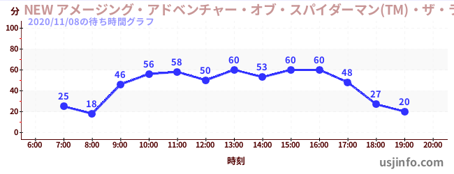 • NEW アメージング・アドベンチャー・オブ・スパイダーマン(TM)・ザ・ライド 4K3D$B$N(B2020年11月08日の待ち時間