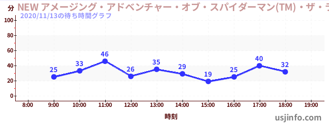 • NEW アメージング・アドベンチャー・オブ・スパイダーマン(TM)・ザ・ライド 4K3D$B$N(B2020年11月13日の待ち時間