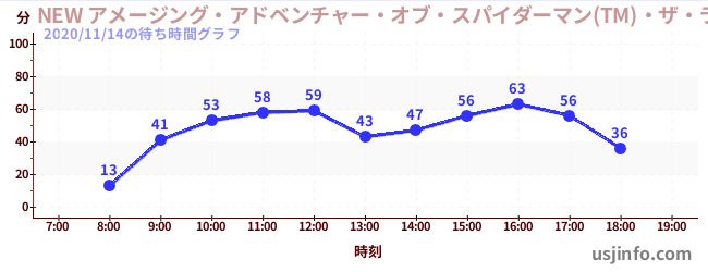 • NEW アメージング・アドベンチャー・オブ・スパイダーマン(TM)・ザ・ライド 4K3D$B$N(B2020年11月14日の待ち時間