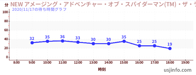 • NEW アメージング・アドベンチャー・オブ・スパイダーマン(TM)・ザ・ライド 4K3D$B$N(B2020年11月17日の待ち時間