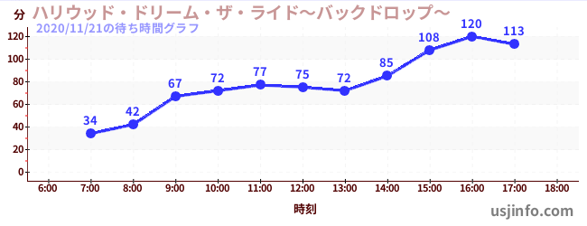 • ハリウッド・ドリーム・ザ・ライド〜バックドロップ〜$B$N(B2020年11月21日の待ち時間