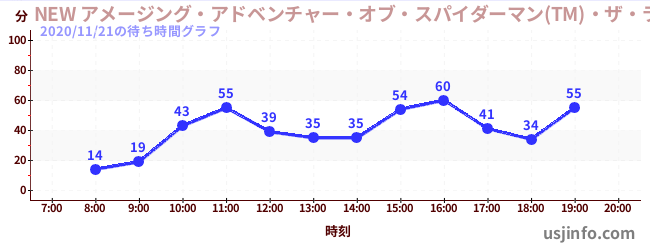 • NEW アメージング・アドベンチャー・オブ・スパイダーマン(TM)・ザ・ライド 4K3D$B$N(B2020年11月21日の待ち時間