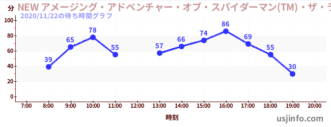 • NEW アメージング・アドベンチャー・オブ・スパイダーマン(TM)・ザ・ライド 4K3D$B$N(B2020年11月22日の待ち時間