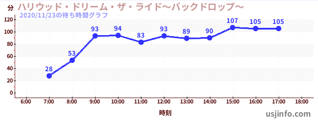 • ハリウッド・ドリーム・ザ・ライド〜バックドロップ〜$B$N(B2020年11月23日の待ち時間