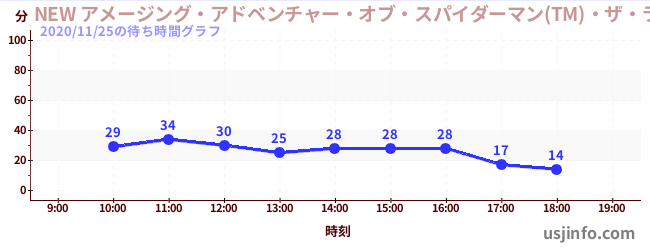 • NEW アメージング・アドベンチャー・オブ・スパイダーマン(TM)・ザ・ライド 4K3D$B$N(B2020年11月25日の待ち時間