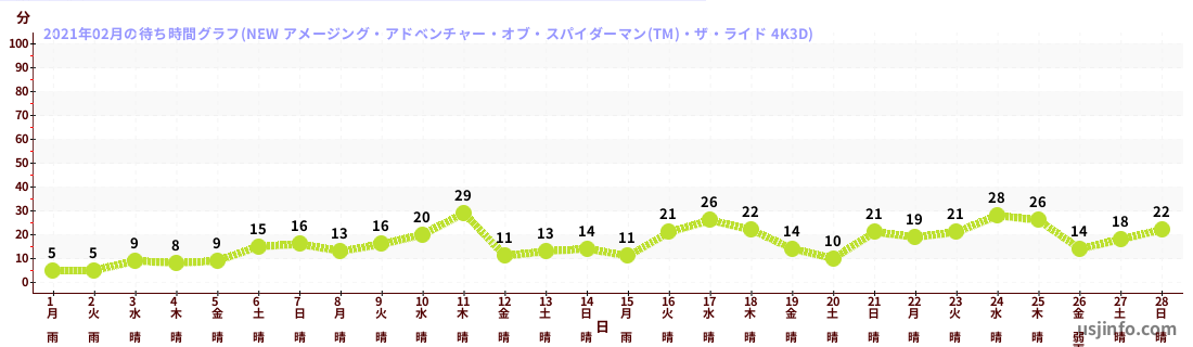 • NEW アメージング・アドベンチャー・オブ・スパイダーマン(TM)・ザ・ライド 4K3D$B$N(B2021年02月01日のの一日平均待ち時間