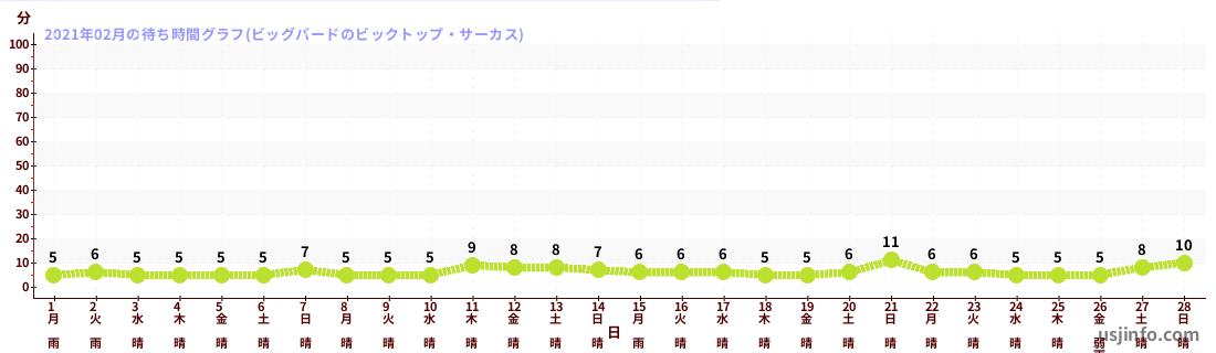• ビッグバードのビックトップ・サーカス$B$N(B2021年02月01日のの一日平均待ち時間