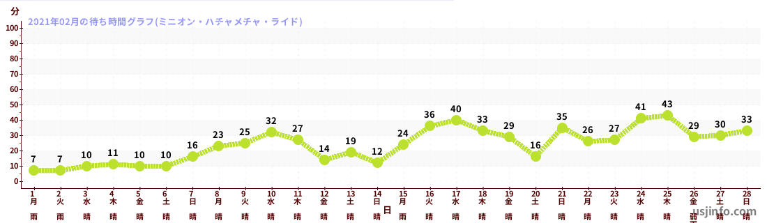 • ミニオン・ハチャメチャ・ライド$B$N(B2021年02月01日のの一日平均待ち時間