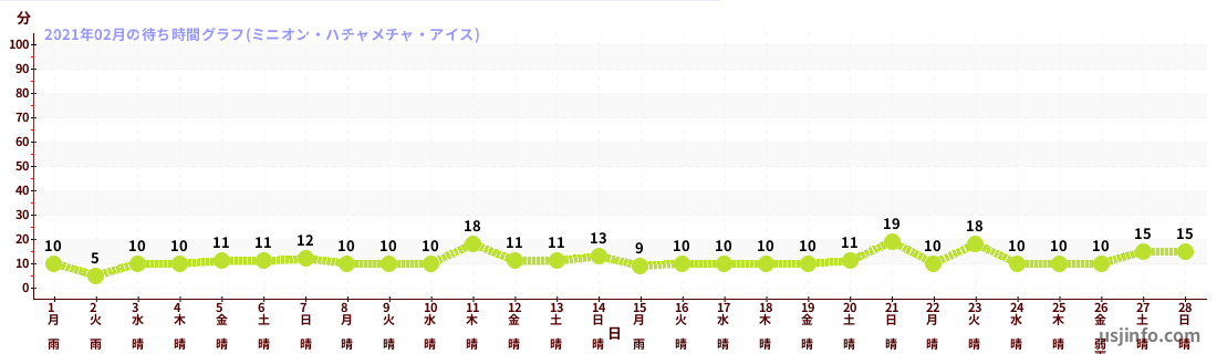 • ミニオン・ハチャメチャ・アイス$B$N(B2021年02月01日のの一日平均待ち時間