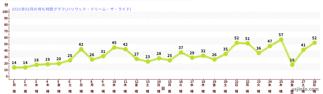• ハリウッド・ドリーム・ザ・ライド$B$N(B2021年02月01日のの一日平均待ち時間