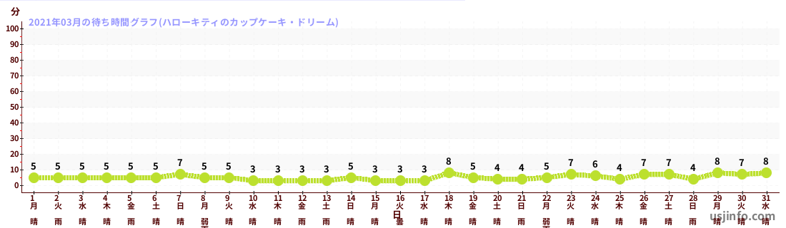 • ハローキティのカップケーキ・ドリーム$B$N(B2021年03月01日のの一日平均待ち時間