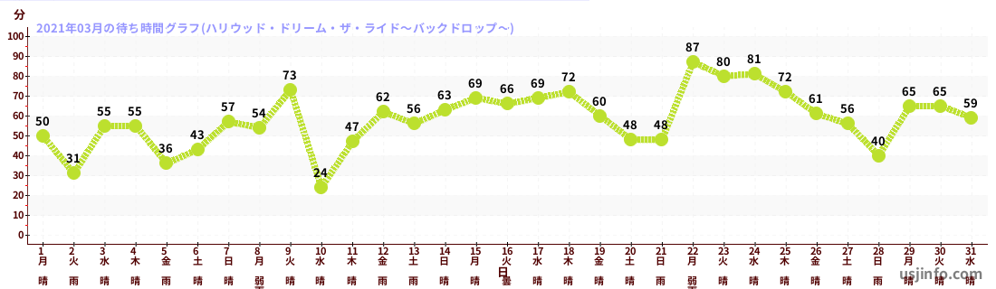 • ハリウッド・ドリーム・ザ・ライド〜バックドロップ〜$B$N(B2021年03月01日のの一日平均待ち時間