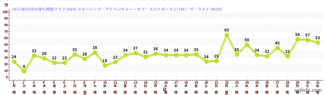 • NEW アメージング・アドベンチャー・オブ・スパイダーマン(TM)・ザ・ライド 4K3D$B$N(B2021年03月01日のの一日平均待ち時間