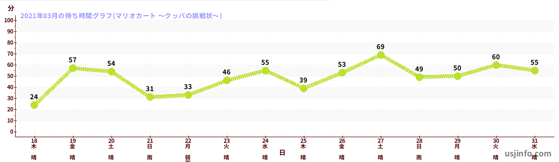 • マリオカート ~クッパの挑戦状~$B$N(B2021年03月01日のの一日平均待ち時間
