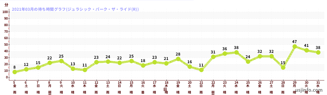 • ジョーズ(R)$B$N(B2021年03月01日のの一日平均待ち時間