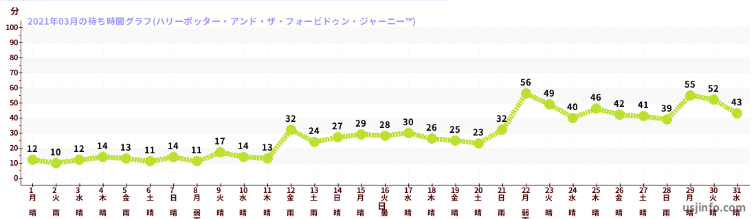 • ハリーポッター・アンド・ザ・フォービドゥン・ジャーニー™$B$N(B2021年03月01日のの一日平均待ち時間