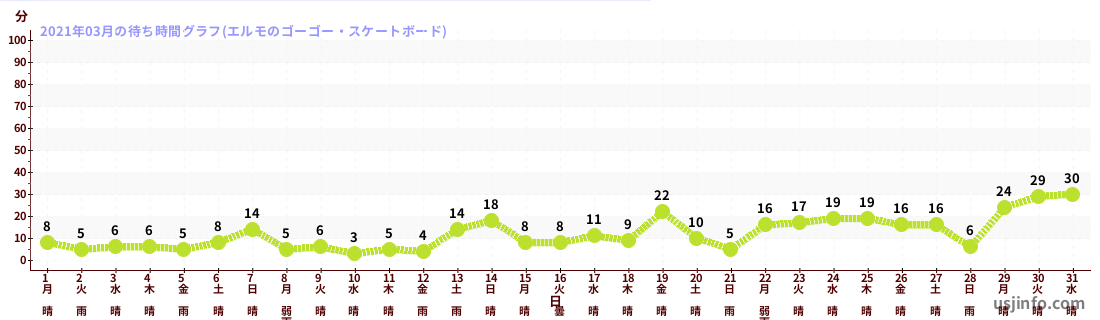 • エルモのゴーゴー・スケートボード$B$N(B2021年03月01日のの一日平均待ち時間