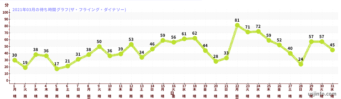• ザ・フライング・ダイナソー$B$N(B2021年03月01日のの一日平均待ち時間