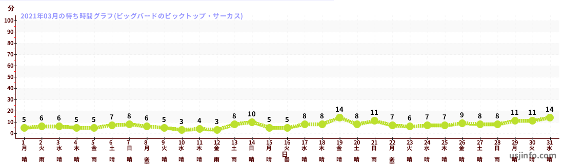 • ビッグバードのビックトップ・サーカス$B$N(B2021年03月01日のの一日平均待ち時間