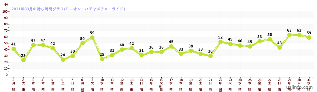• ミニオン・ハチャメチャ・ライド$B$N(B2021年03月01日のの一日平均待ち時間