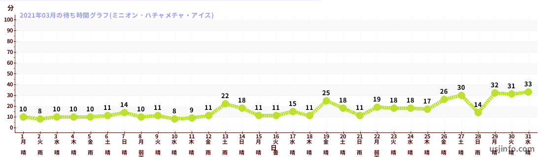 • ミニオン・ハチャメチャ・アイス$B$N(B2021年03月01日のの一日平均待ち時間