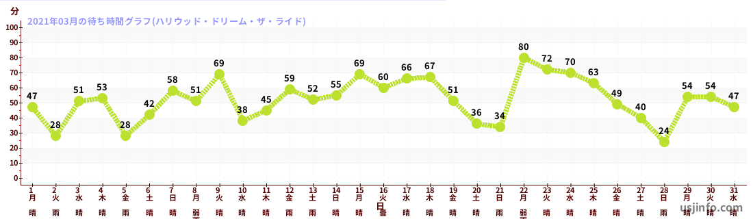 • ハリウッド・ドリーム・ザ・ライド$B$N(B2021年03月01日のの一日平均待ち時間