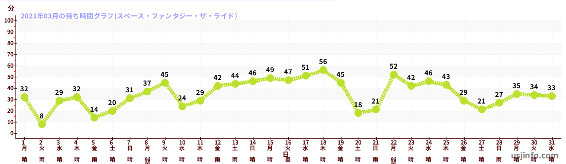 • スペース・ファンタジー・ザ・ライド$B$N(B2021年03月01日のの一日平均待ち時間