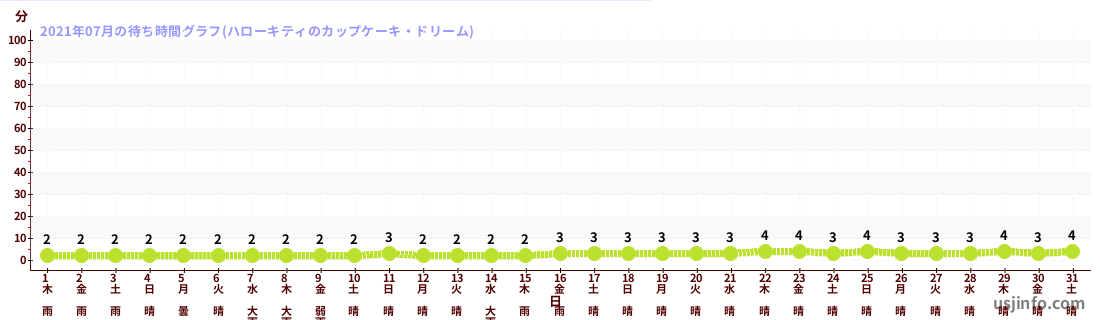 • ハローキティのカップケーキ・ドリーム$B$N(B2021年07月01日のの一日平均待ち時間