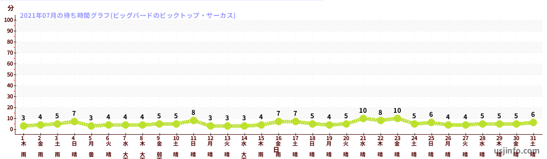 • ビッグバードのビックトップ・サーカス$B$N(B2021年07月01日のの一日平均待ち時間