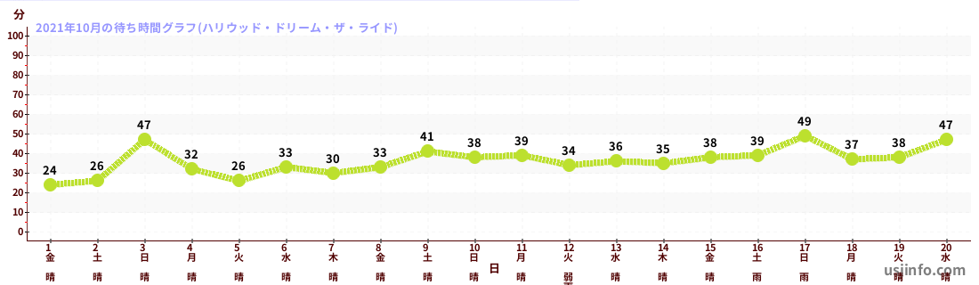 • ハリウッド・ドリーム・ザ・ライド$B$N(B2021年10月01日のの一日平均待ち時間