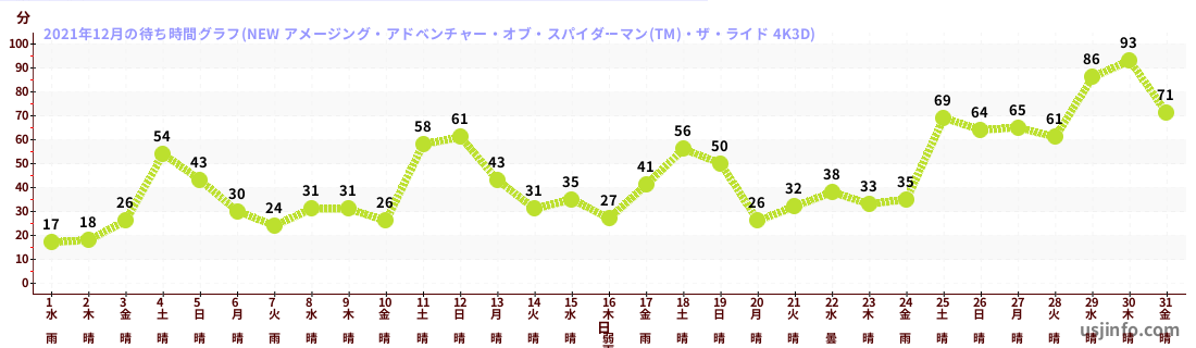 • NEW アメージング・アドベンチャー・オブ・スパイダーマン(TM)・ザ・ライド 4K3D$B$N(B2021年12月01日のの一日平均待ち時間