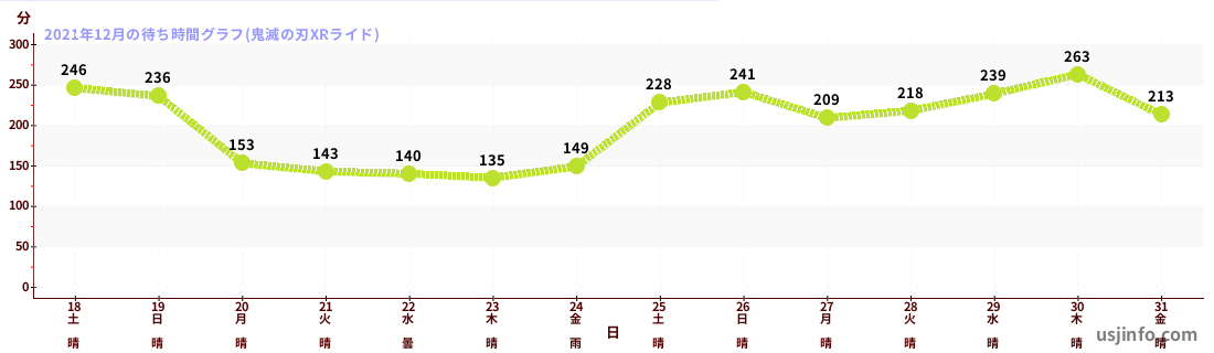 • 鬼滅の刃XRライド$B$N(B2021年12月01日のの一日平均待ち時間