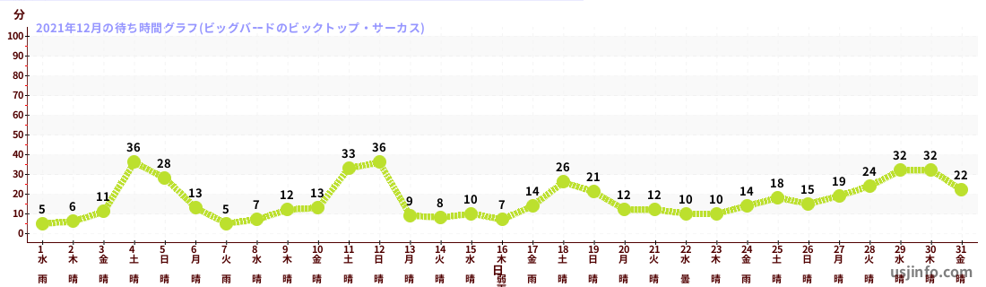 • ビッグバードのビックトップ・サーカス$B$N(B2021年12月01日のの一日平均待ち時間