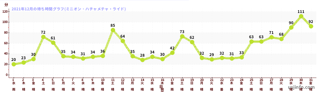• ミニオン・ハチャメチャ・ライド$B$N(B2021年12月01日のの一日平均待ち時間