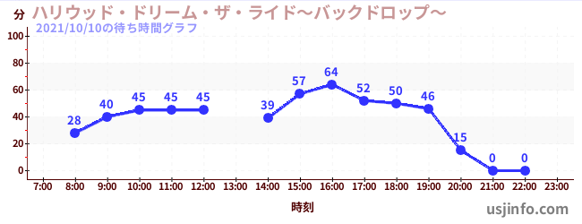 • ハリウッド・ドリーム・ザ・ライド〜バックドロップ〜$B$N(B2021年10月10日の待ち時間