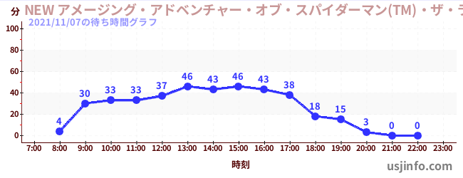 • NEW アメージング・アドベンチャー・オブ・スパイダーマン(TM)・ザ・ライド 4K3D$B$N(B2021年11月07日の待ち時間