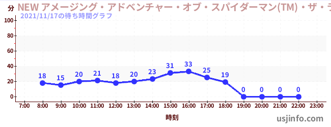 • NEW アメージング・アドベンチャー・オブ・スパイダーマン(TM)・ザ・ライド 4K3D$B$N(B2021年11月17日の待ち時間